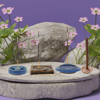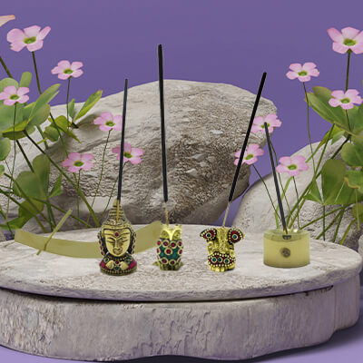 Incense holders come in various designs and materials, such as ceramic, brass, or wood, for sticks, cones, and dhoop.